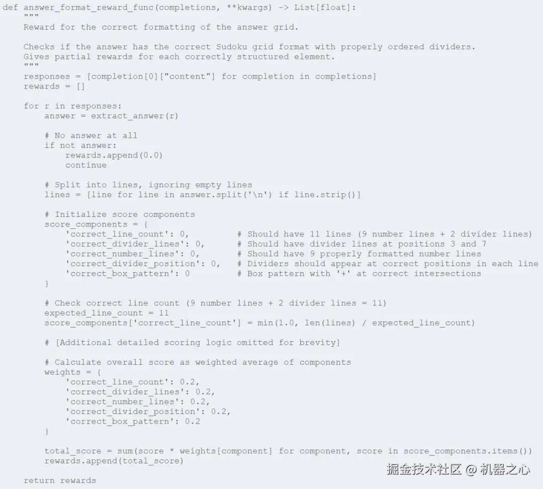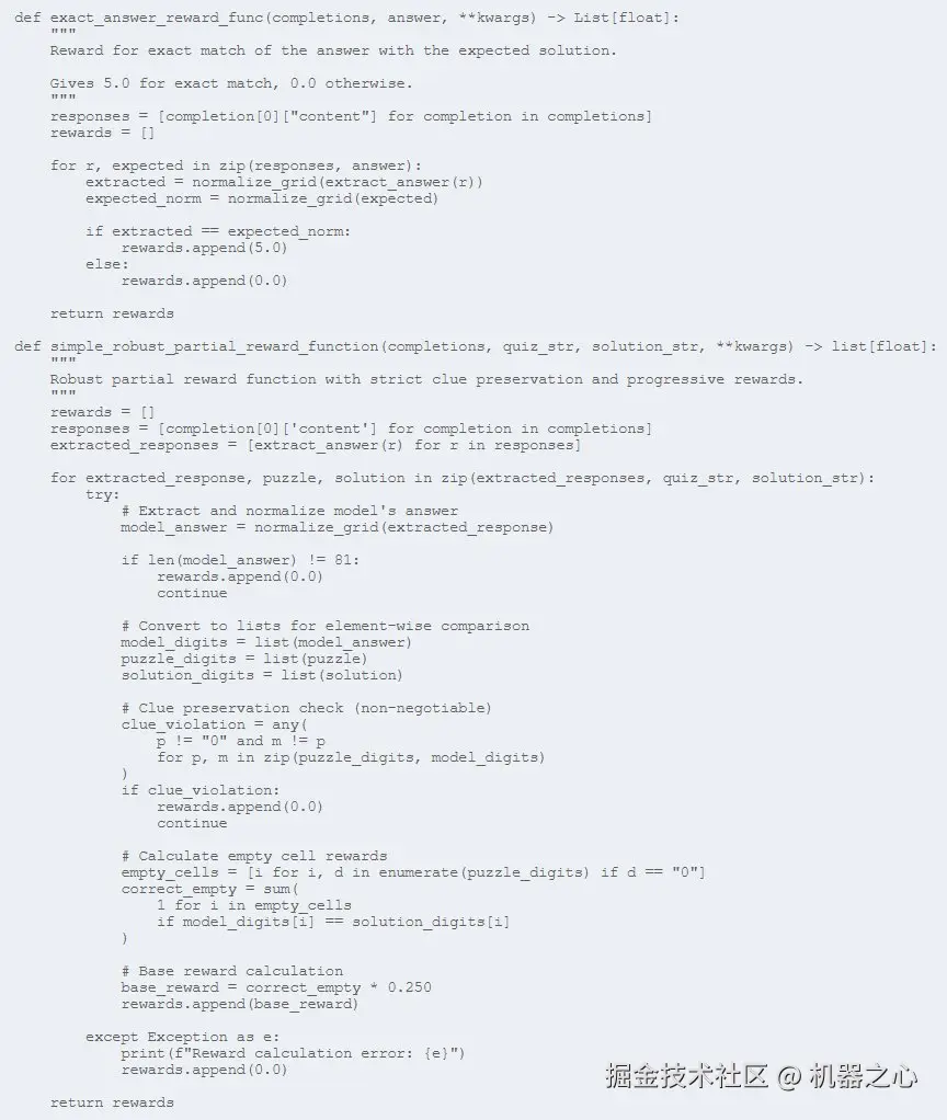 该函数会检查每行、每列和每 3×3 框是否有重复项,模型满足每个约束时都能获得一些奖励。这能让模型学会数独的基本规则,鼓励它生成有效的解答,即使它们与预期答案不完全匹配。