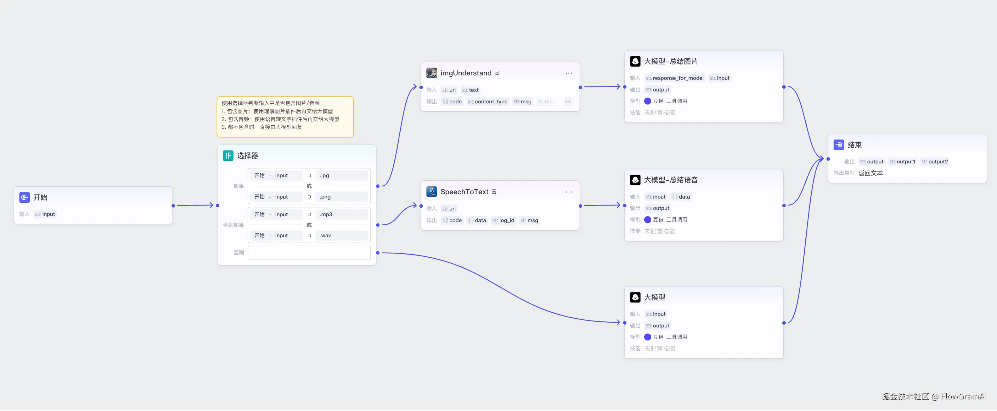 - 扣子工作流:通过选择器节点判断用户输入的是图片、声音或文本,调用不同的模型节点总结分析再返回给用户。