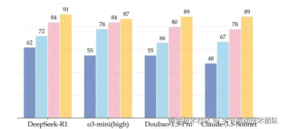 o3-mini 系列在简单和中等难度题目的分数低于 Doubao-1.5-pro ,但在困难问题上却明显超过它,说明推理模型在难题上表现突出,却在广度知识覆盖方面存在不足。