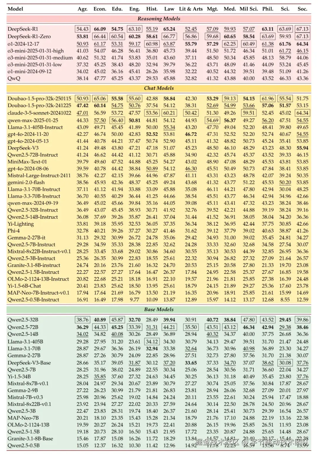 LLMs 在不同学科的表现