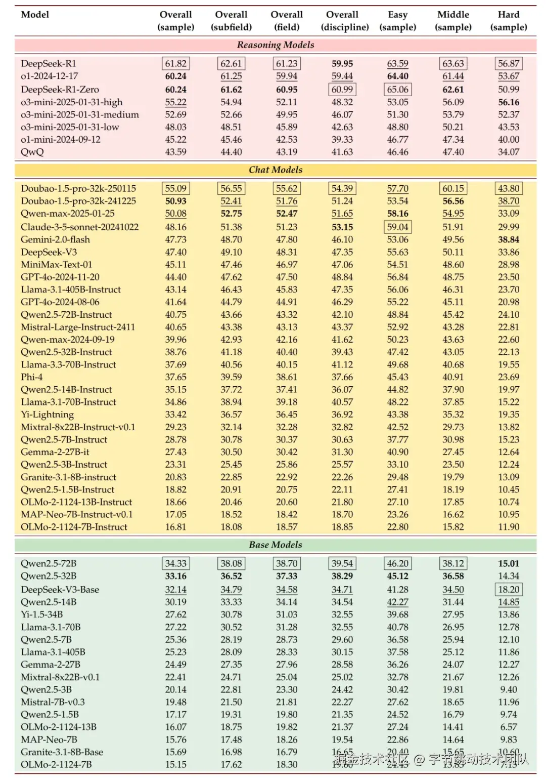 其中,推理模型和聊天模型采用零样本评估,基础模型采用五样本评估(方法与 MMLU-Pro 类似),并将温度参数设置为 0,推理模型最大生成 token 数为 32K,其他模型为 4K。