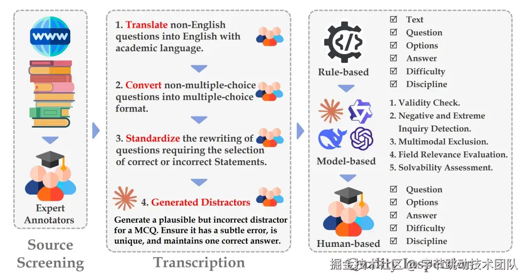 为确保题目的高标准质量,团队摒弃了众包注释员收集资源的方式,转而由专家注释员负责从可信来源(如教科书和权威练习网站)筛选和收集原始问题,并要求提供来源截图。这一策略避免了早期大量无效问题的产生,提升了质量检查的效率和准确性。