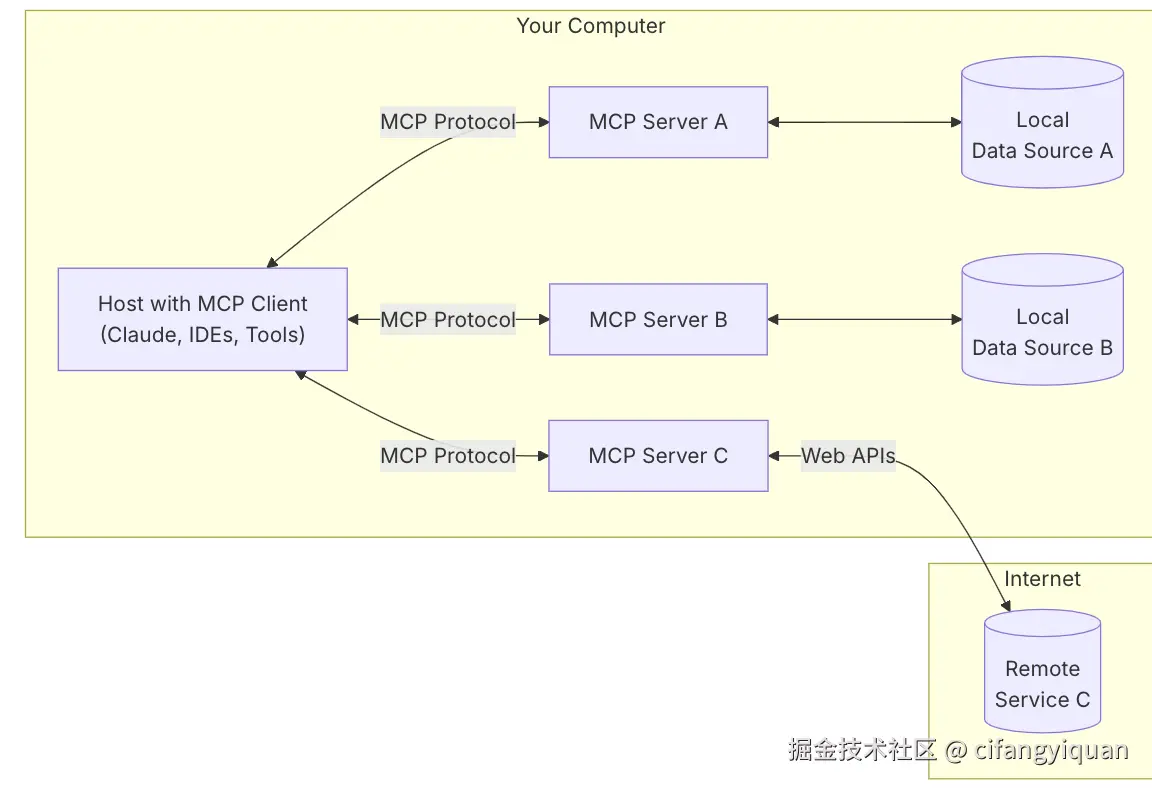 - 远程服务:通过互联网(例如,通过 API)可用的外部系统,MCP 服务器可以连接到