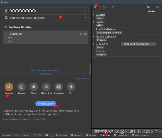① 打开Profiler性能分析器; ② 选择待分析的设备与应用进程; ③ 选择Launch工具; ④ 点击create Session按钮创建启动分析任务; ⑤ 准备好调试环境后,点击开始录制启动数据,再次点击结束录制。