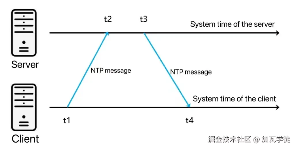 NTP通过四时间戳计算网络延迟和时钟偏差:
