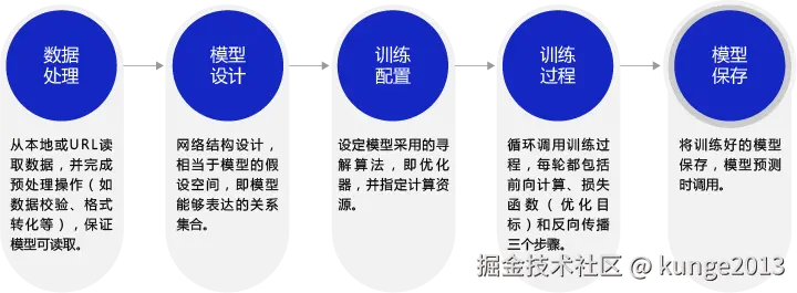 使用飞桨完成手写数字识别任务的流程如 图2 所示,与使用飞桨完成房价预测模型任务的流程一致,下面的章节中我们将详细介绍每个步骤的具体实现方法和优化思路。