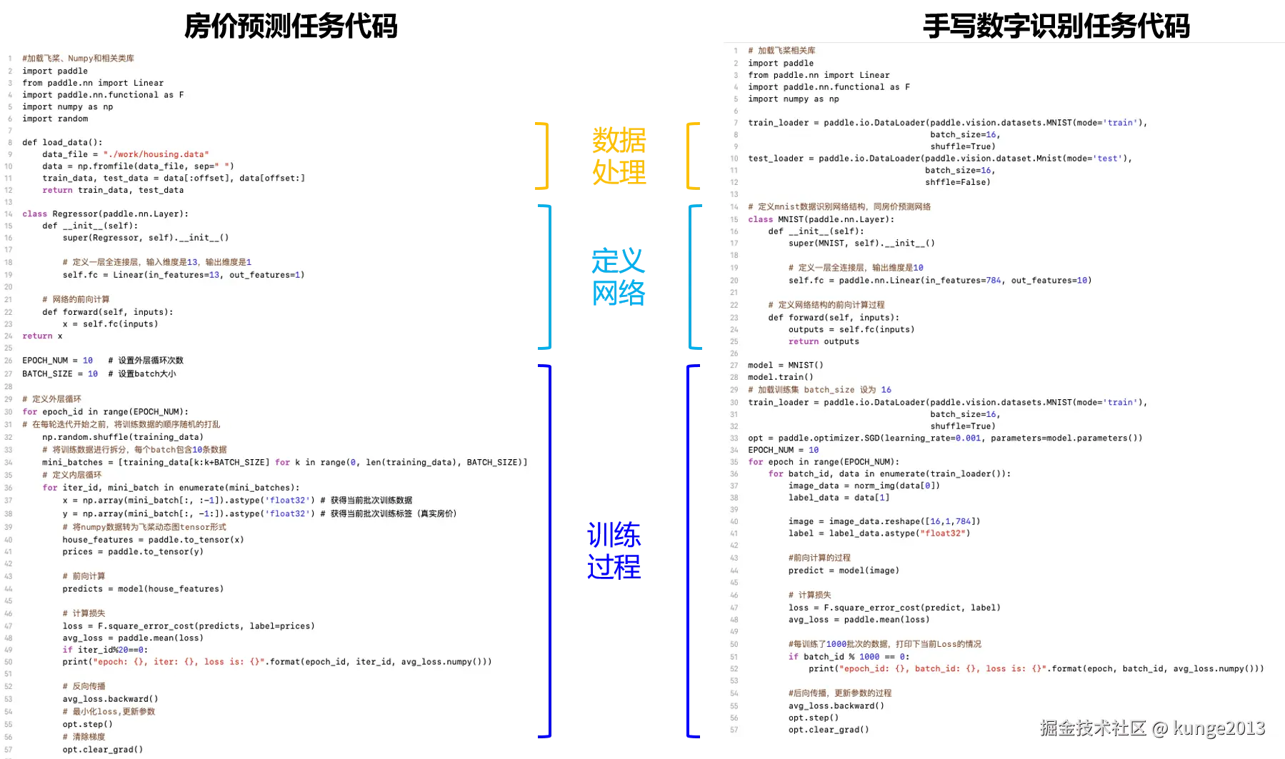 在探讨手写数字识别任务的实现方案之前,我们先“偷偷地看”一下程序代码。不难发现,与上一章学习的房价预测任务的代码比较,二者的程序结构是极为相似的,如 图3 所示。