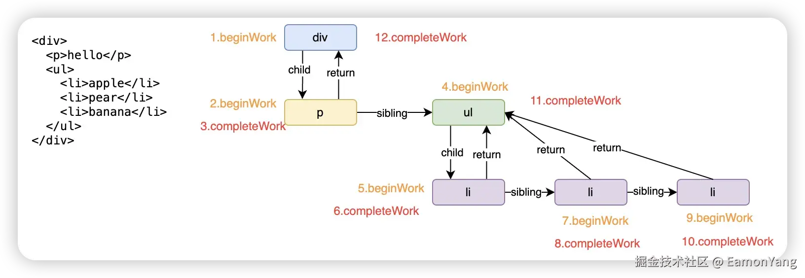 performUnitOfWork 方法会创建下一个 FiberNode,并且还会将已创建的 FiberNode 链接起来(child,return,sibling),从而形成一个链表结构的 FiberTree