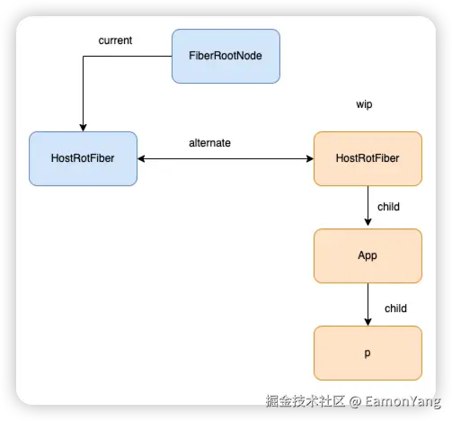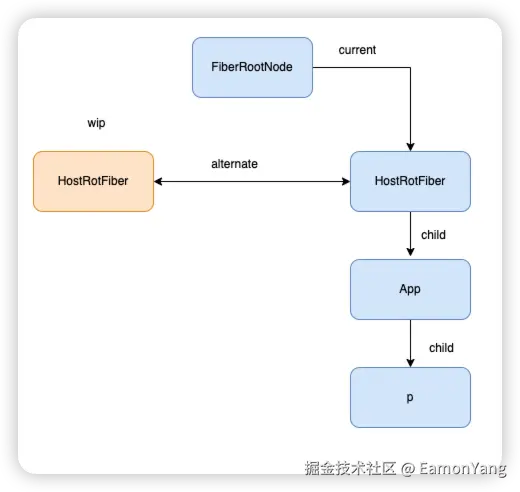 生成的 wip FiberTree 里面的每一个 FiberNode 会和 current FiberTree 里面的 FiberNode 进行关联。关联的方式就是通过 alternate。但是目前 currentFiberTree 里面就只有一个 HostRootFiber