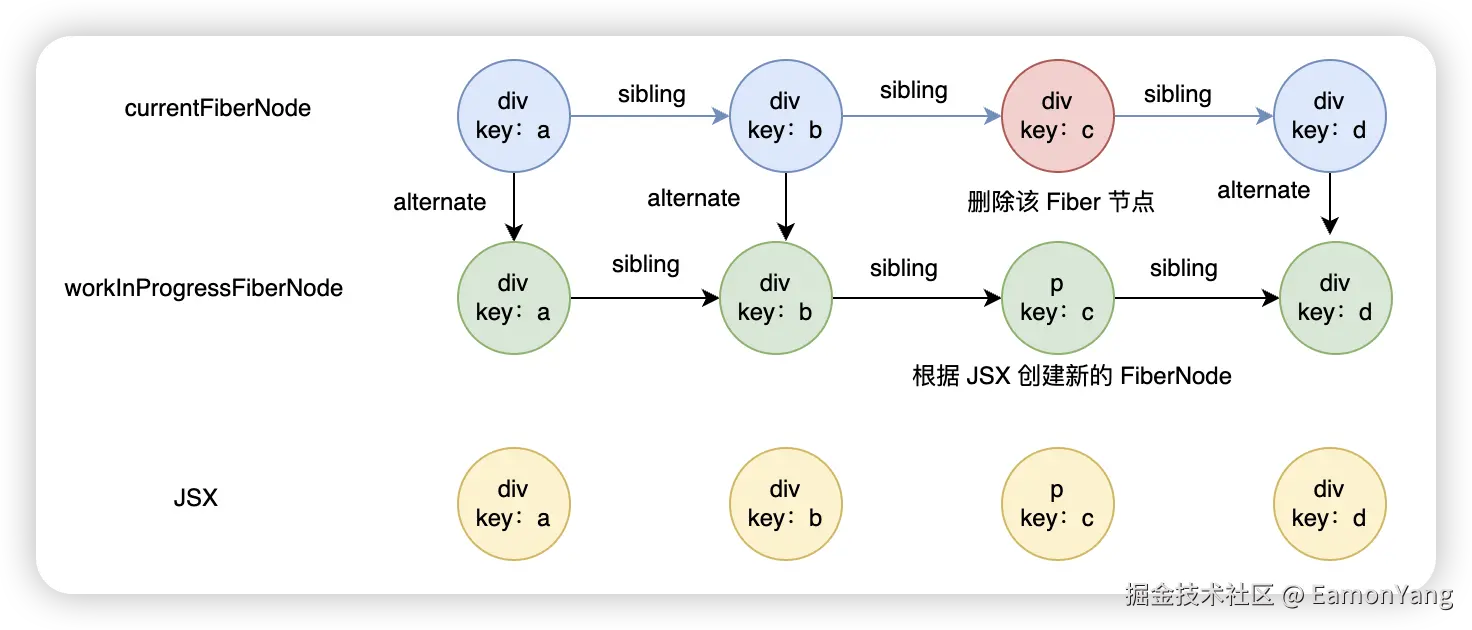 首先和上面一样,a,b 节点复用,但是第三个节点 key 相同,type 不同,此时就会将对应旧的 FiberNode 放入 deletions 数组中,回头进行统一删除,根据新的 React 元素创建一个新的 FiberNode,但是此时的遍历是不会结束的,继续向后遍历