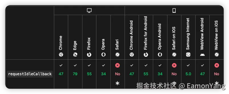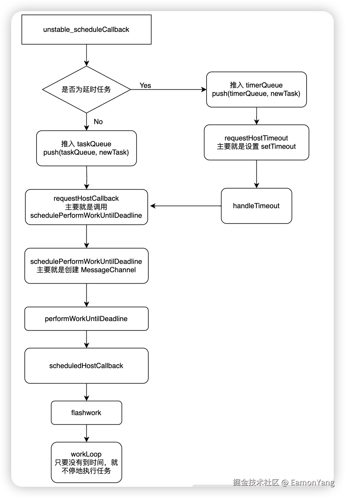 - 如果还需要继续执行,就利用事件循环机制,在浏览器空余后继续执行,机制主要是用MessageChannel,如果不支持也有其他的兜底策略,如node中使用setImmediate,兜底使用计时器