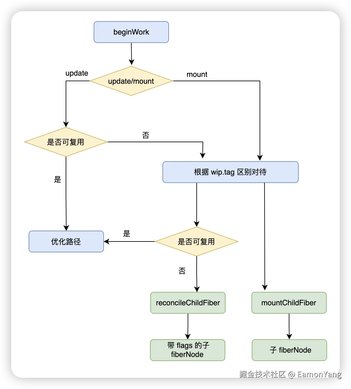 如果是 update,接下来会判断 wipFiberNode 是否能够复用,如果不能复用,那么 update 和 mount 流程大体一致