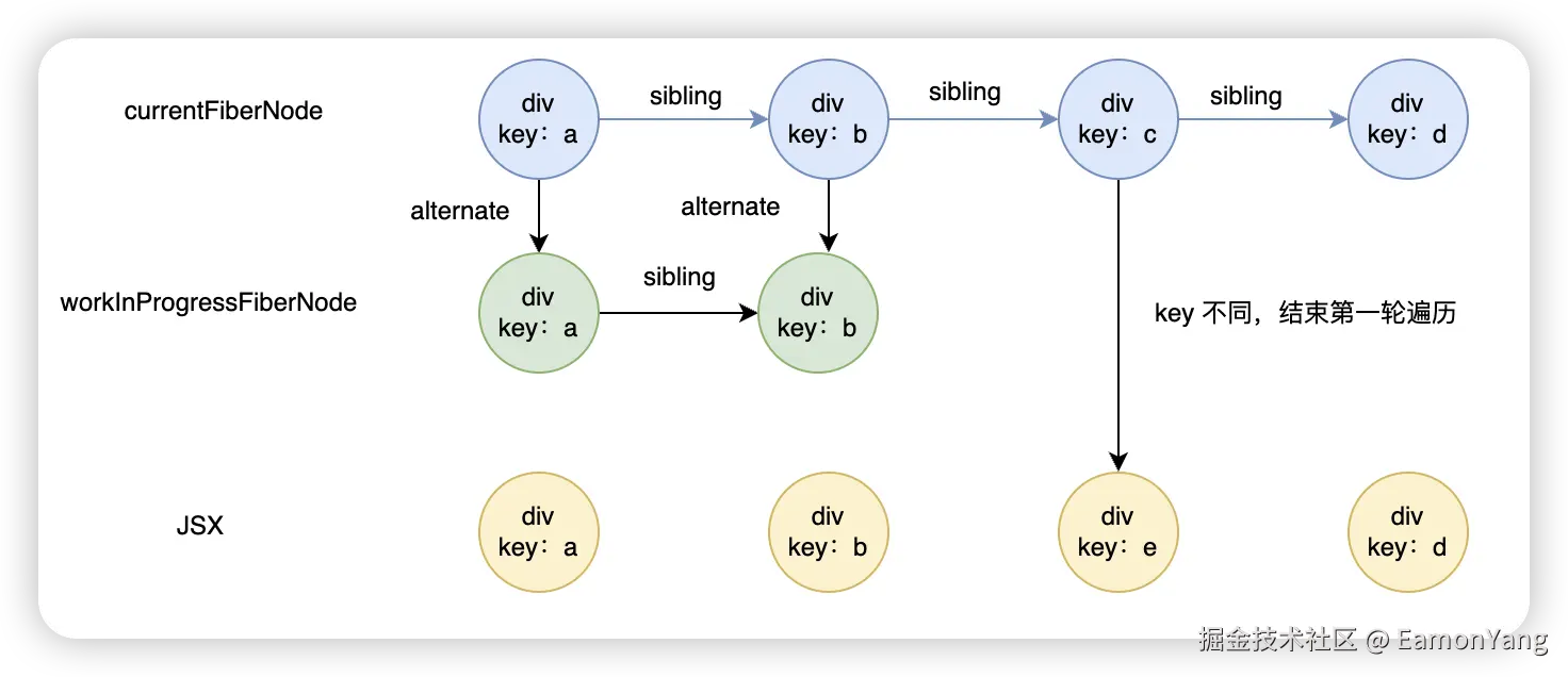 首先 遍历到div.key.a发现该 fibernode 可以复用,继续发现 div.key.b也可以复用,到 div.key.e发现 key 不同,第一轮遍历就结束了