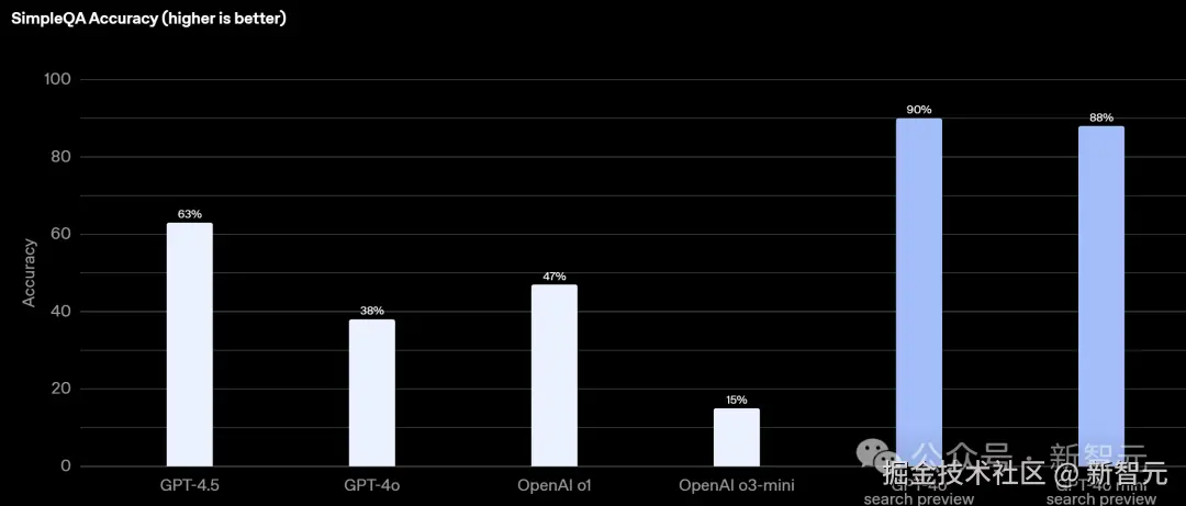 其中,「网络搜索工具」可让模型即时访问互联网信息,与驱动 ChatGPT Search 是同一个工具,在 Simple QA 中,经过微调后的 GPT-4o 拿下 90% 高分,GPT-4o mini 得分为 88%。