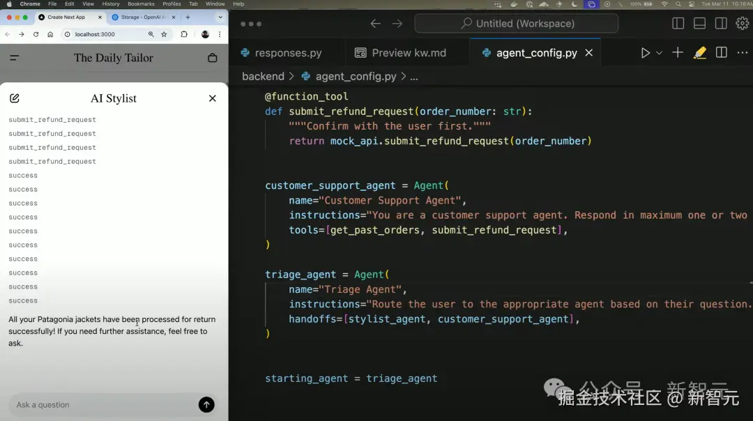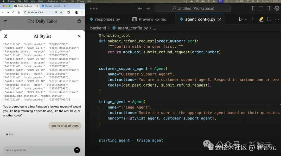 现在,他们已经有了一个造型师智能体,和一个退货智能体,然后需要实现一个简单却强大的概念——任务交接。