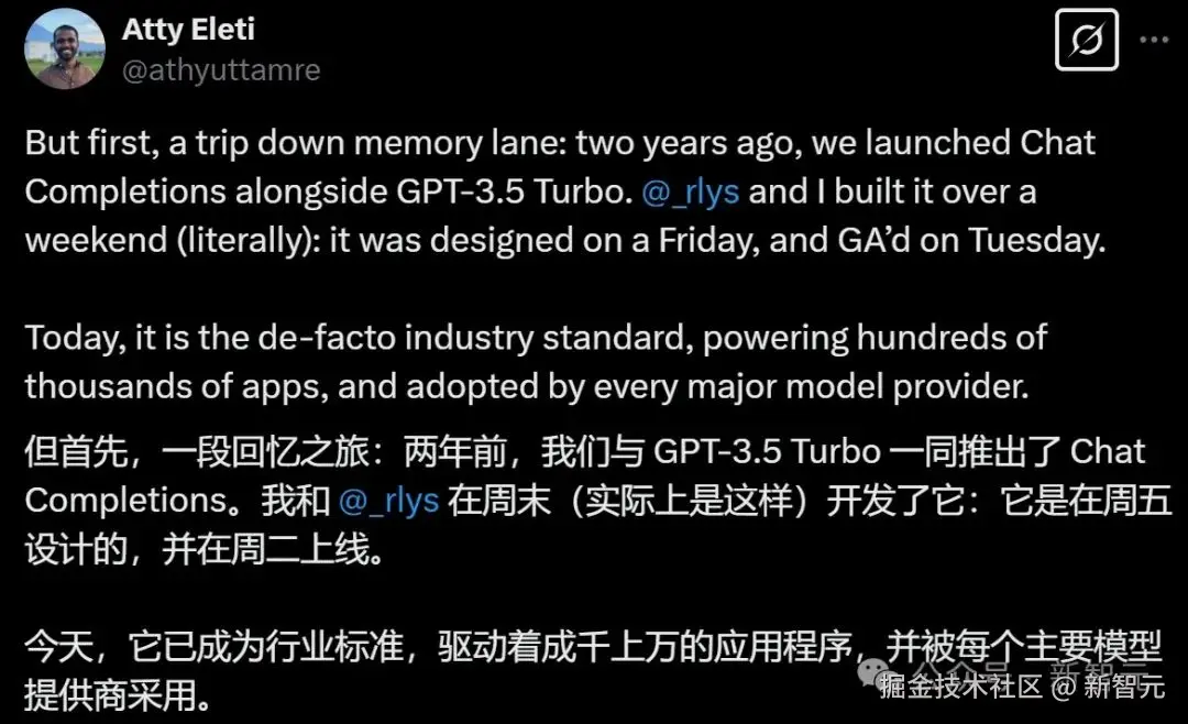 OpenAI 的研究员 Atty Eleti 还在 X 上分享了设计 Responses API 的故事。