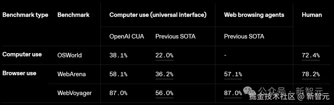 例如,CUA 在 OSWorld 中成功率仅为 38.1%,这表明该模型在操作系统任务自动化方面尚未达到高度可靠性。因此在这些场景中,OpenAI 建议还需要有人类的监督。