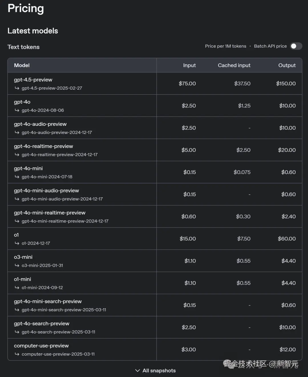 下图是 Responses API 调用文本模型的价格。全部模型的定价可以参考他们的定价页面。