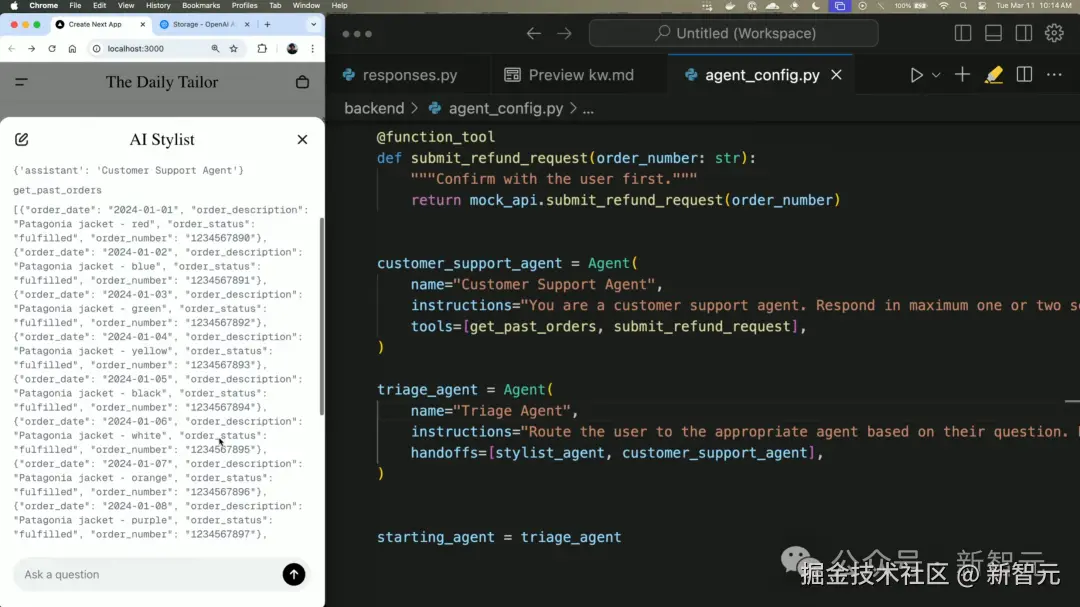 整个流程是这样的:分类智能体将任务转到了客服智能体,然后客服智能体主动调用了 getPastOrders 函数,让我们看到了 Kevin 所有的巴塔哥尼亚商品。