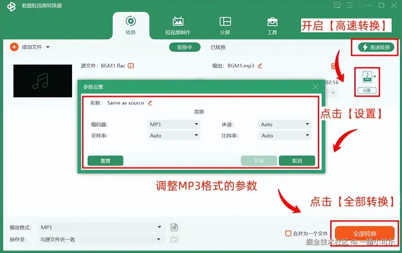 步骤3:开启【高速转换】,然后点击【设置】调整MP3格式的参数,最后点击【全部转换】即可。