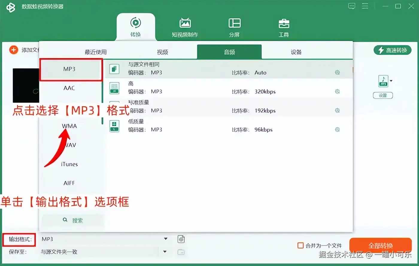 步骤2:单击格式转换界面中的【输出格式】选项框,在弹出来的格式选择窗口中,点击选择【MP3】格式。