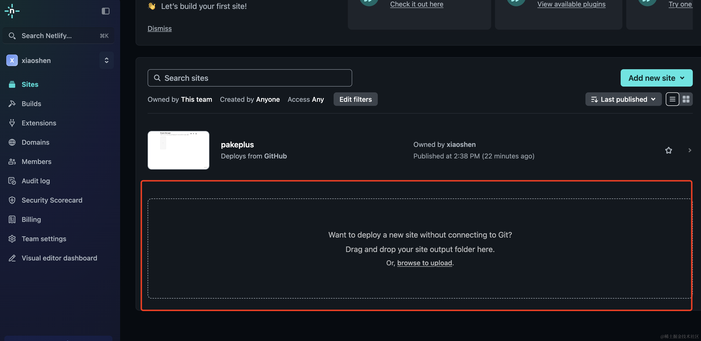 也可以通过将你本地编译之后的dist文件夹直接上传上去实现部署,将你编译之后的dist文件夹拖进来,就可以实现上传部署,还是很方便的,但是缺点就是不能像github上一样实时推送部署的效果,需要你手动更新部署