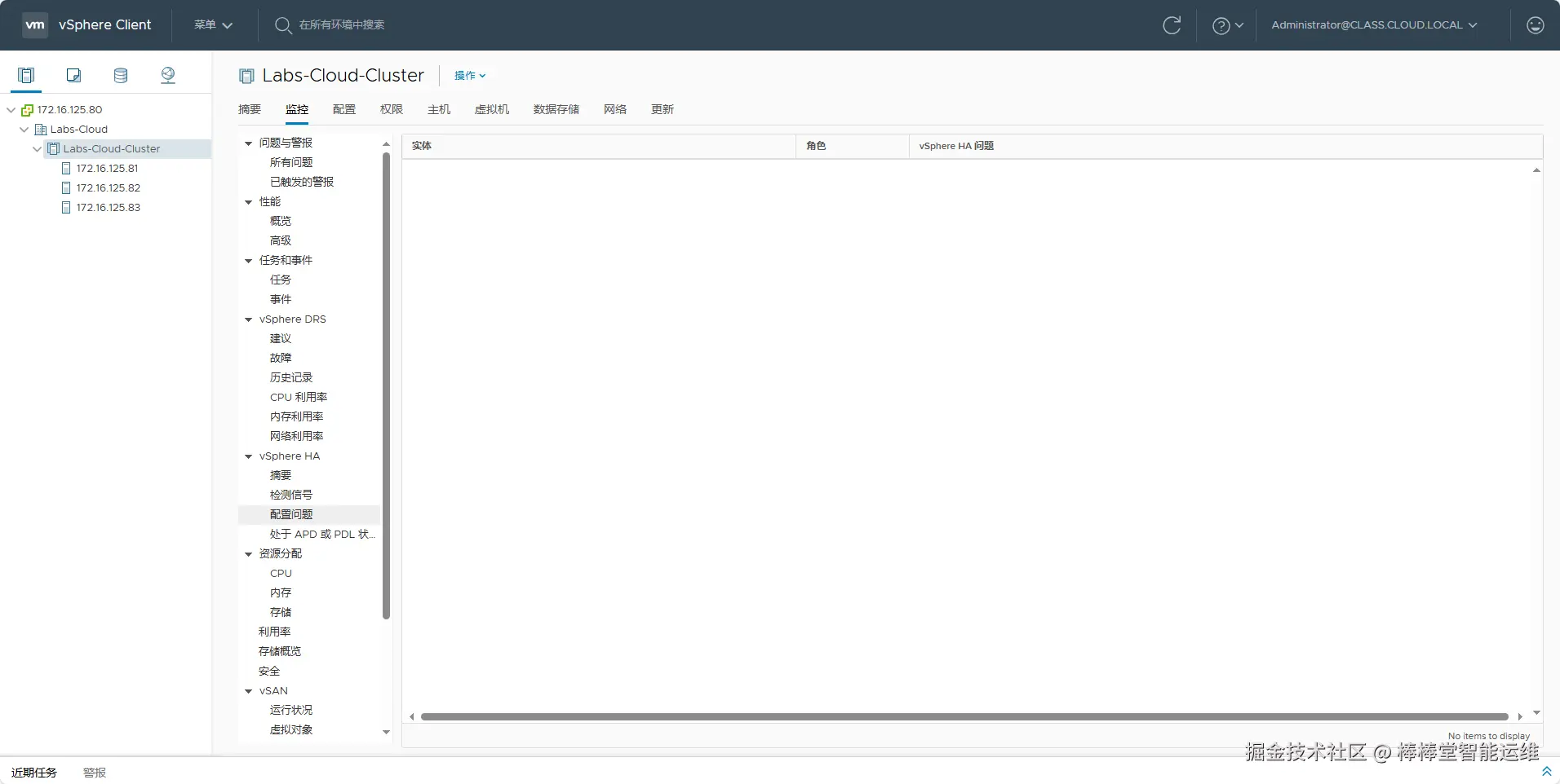 (7)选择“监控”-“vSphere HA”-“配置问题”,查看群集监控中vSphere HA配置问题,如果HA配置有问题,此处会显示,如图3-75所示。