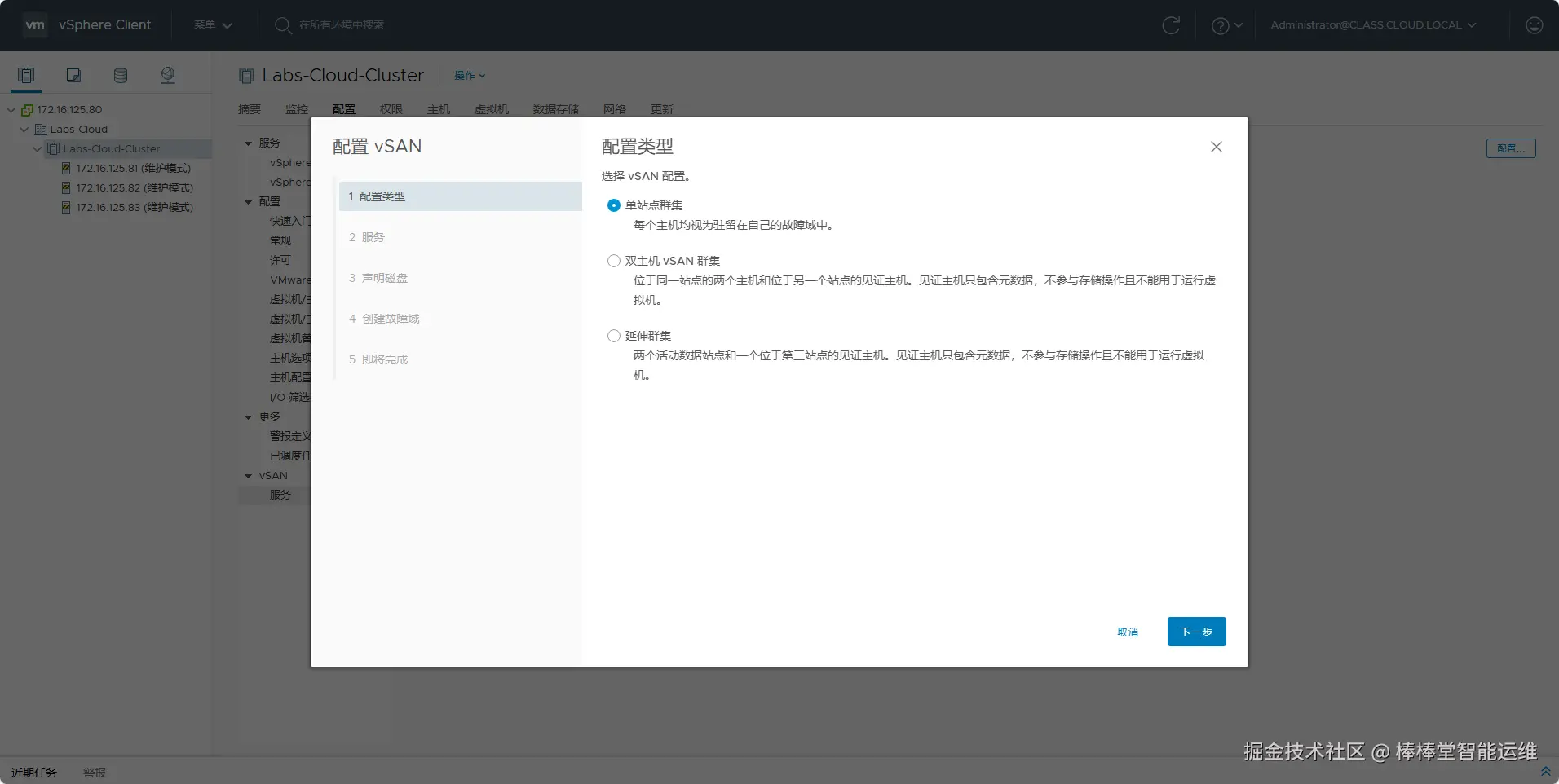 - 选中集群“Labs-Cloud-Cluster”,选择“配置”-“vSAN”-“服务”,单击【配置】,弹出“配置 vSAN”向导框,在向导“1 配置类型”中选择vSAN配置为“单站点群集”,单击【下一步】,如图3-57所示。