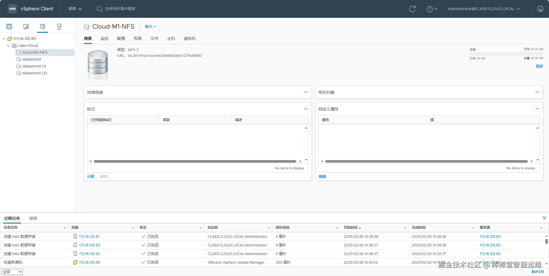 在vSphere Web Clien控制台中选择“存储”图标,选中“Cloud-组号-NFS”,单击“摘要”,查看NFS数据存储详细信息,如图3-54所示。