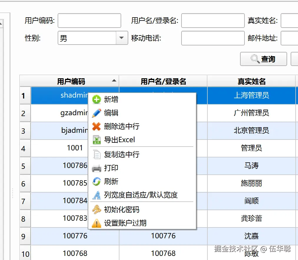列表包含有有树形列表、条件查询框、通用条件(查询、新增、编辑、删除、导出)等、列表展示、分页导航、右键菜单等内容。这些都是在基类中进行了统一的抽象处理,子类根据需要调整属性或重写相关函数即可实现个性化的界面定义。