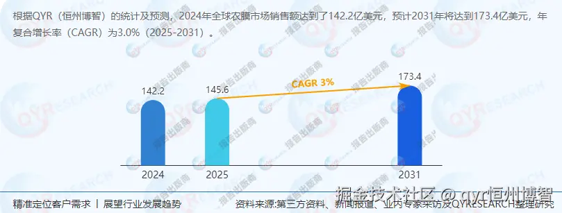 全球市场规模:根据QYResearch最新调研报告显示,2024年全球农膜市场销售额达到了142.2亿美元,预计2031年将达到173.4亿美元,年复合增长率(CAGR)为3.0%(2025-2031)。