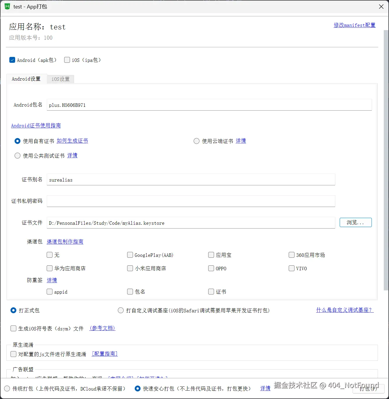 包名(安卓)或Bundle ID(AppID)(iOS),以及证书信息(需提前生成安卓证书和 iOS 证书,进行当前步骤时 Hbuilderx 给出了详细的证书生成方法,此处不再赘述) -