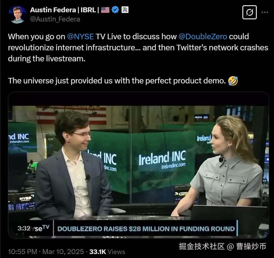 就在昨天,Double Zero创始人Austin Federa接受了纽约证券交易所(NYSE)TV直播专访,详细阐述了项目如何颠覆互联网基础设施。直播期间,Twitter甚至意外宕机,事后他在推文中调侃称这正是“宇宙为他们呈现的完美产品演示”,暗示当前的互联网架构确实存在瓶颈,而Double Zero有望成为破解之道。