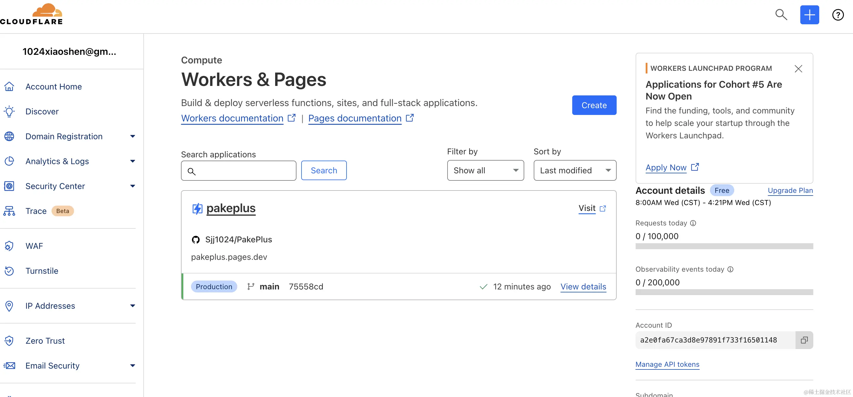 并发构建数:1(如果有多个pages,同一时刻只能进行其中一个的构建)每月构建数:500(每个月只能帮你构建500次)自定义域名:100个,一个pages最多20,000个文件,最大单个文件限制:25MB,每日限制函数请求数:100,000次(超出后会失败),静态文件请求次数:无限,这些限制对于一个过气(压根没人看)的个人博客来说绰绰有余了,而且cloudflare的防护能力在哪里,被盗刷访问量的几率并不大。而且静态文件的访问次数是没有做任何限制的。比如我的项目:pakeplus.pages.dev/