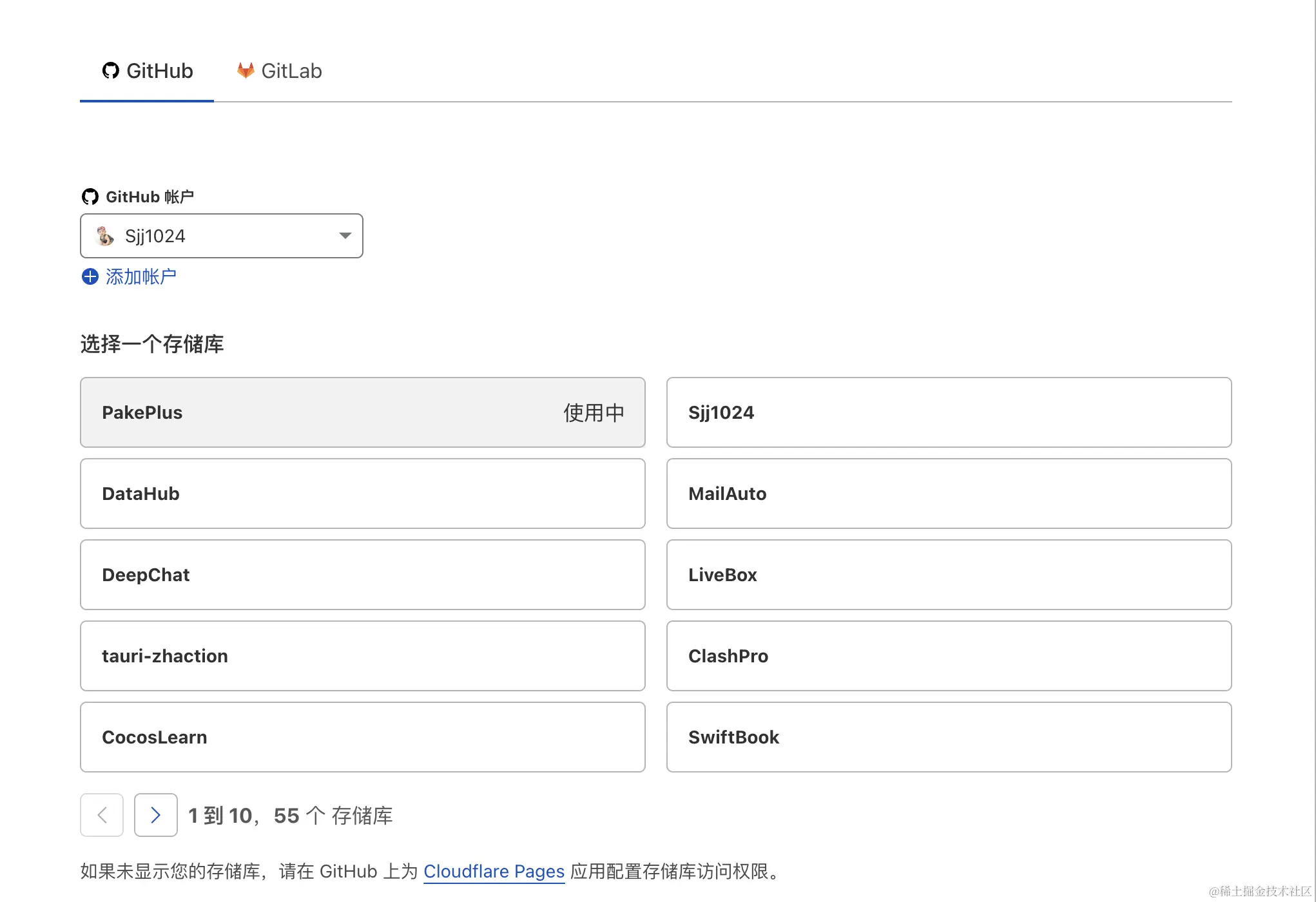 如果使用git,就需要github授权,点击授权后,就可以拿到你的github仓库列表,然后选择你要发布的仓库,就可以直接发布了: