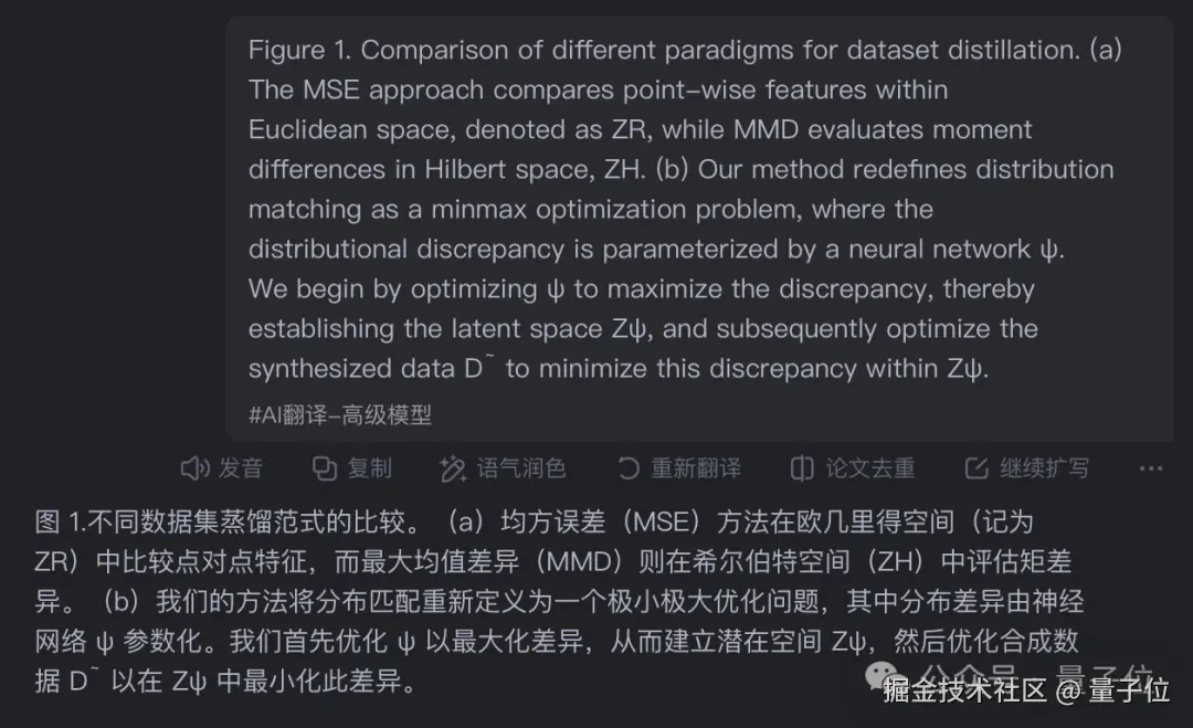 可以看到原文图注中 MSE、MMD 都只提供了缩写。子曰 2.0 准确将英文缩写翻译为了计算机领域的专有词汇,给出了更完整且正确的翻译(下文标粗部分)。