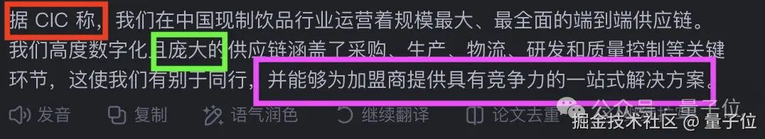 比如翻译蜜雪冰城招股书的内容时,原文 “according to CIC” 部分里的 CIC(图中红色框),由于提供的文本片段不完整,子曰 2.0 根据上下文无法得知它是什么名词的缩写,因此选择不翻译。