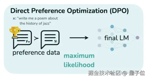DPO 是一种基于人类偏好数据进行优化的方法,它避免了传统强化学习中复杂的奖励模型训练和策略优化过程,将偏好学习转化为一个简单的二分类问题,直接优化模型的输出相对概率。