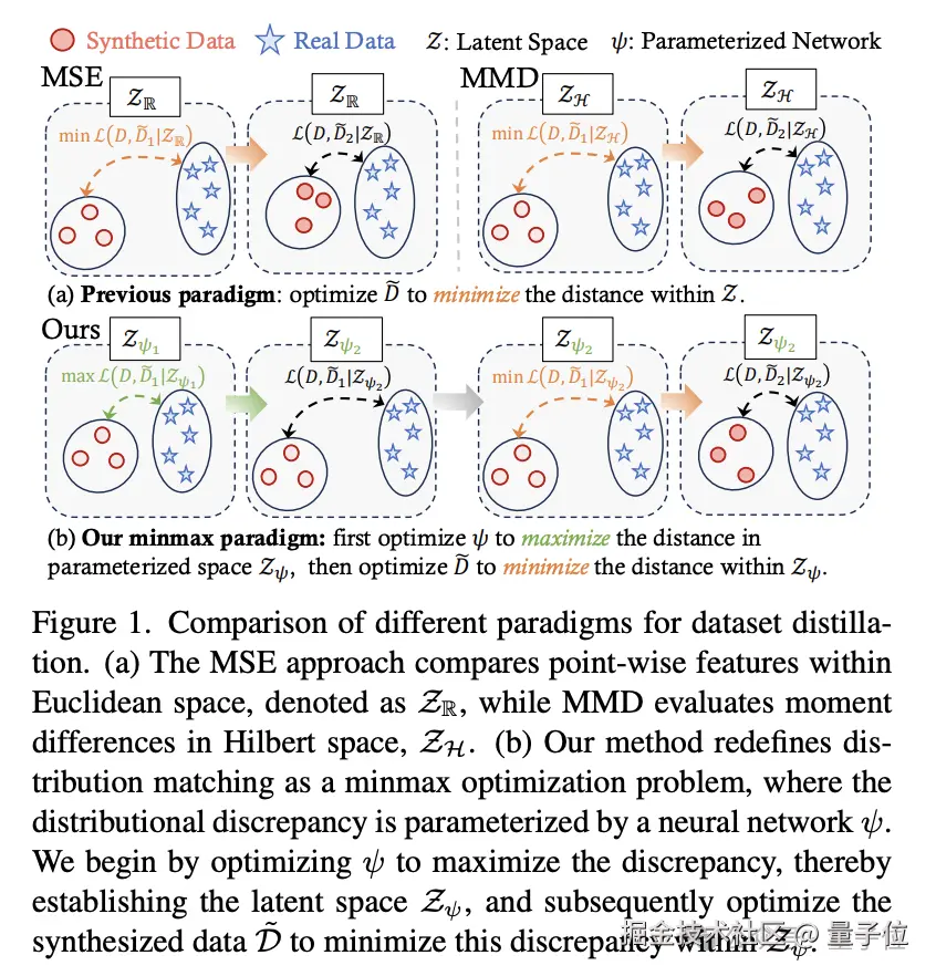 图 1. 不同数据集蒸馏范式的比较。(a) MSE 方法在欧几里得空间 (记为 ZR) 中比较逐点特征,而 MMD 在希尔伯特空间 (ZH) 中评估矩分布差异。