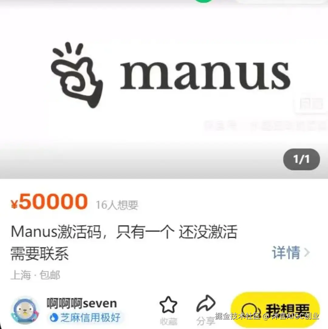 由于Manus目前处于内测阶段,内测码极为稀缺,市场价格已被炒至50000+,获取体验机会十分有限。