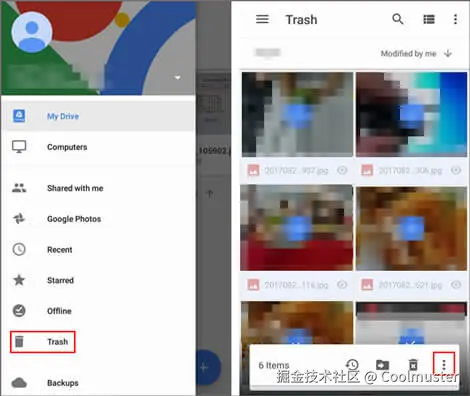打开 Google Drive 程序,然后单击左上角的三破折号图标转到垃圾箱。