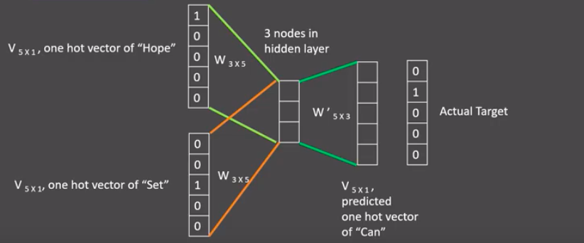 模型训练时, Hope,can,set等词汇都使用它们的one-hot编码. 如图所示: 将can的one-hot编码与变换矩阵(即参数矩阵3x5, 这里的3是指最后得到的词向量维度)相乘, 得到目标词汇表示矩阵(3x1)。