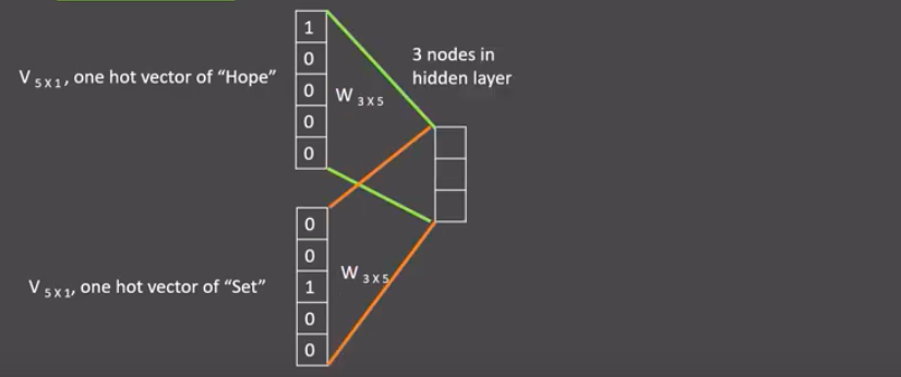 若给定训练语料仅一句话:Hope can set you free(愿你自由成长),窗口大小为3,因此模型的第一个训练样本来自Hope can set。CBOW模式,所以将使用Hope和set作输入,can作输出,在模型训练时, Hope,can,set等词汇都使用它们的one-hot编码,如图所示: 每个one-hot编码的单词与各自的变换矩阵(即参数矩阵3x5,3指最后得到的词向量维度)相乘之后再相加,得到上下文表示矩阵(3x1):