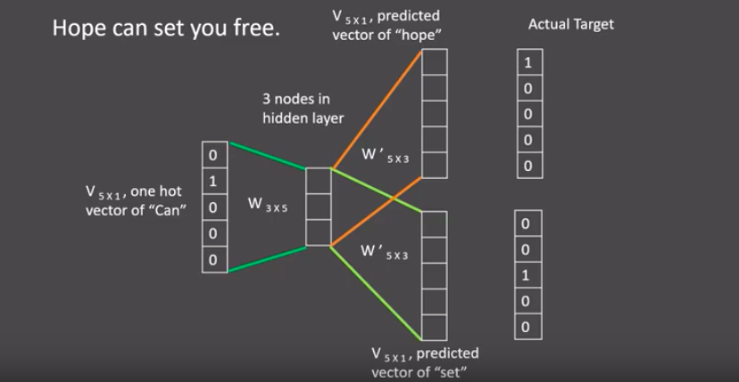 Hope can set you free,窗口大小为3,因此模型的第一个训练样本来自Hope can set,因skipgram模式,所以将用can作输入 ,Hope和set作输出。