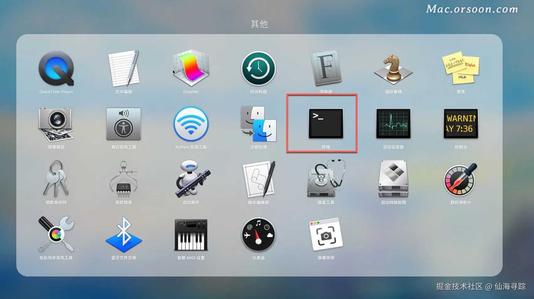 当我们不想要隐藏某个文件或目录的时候该怎么操作呢?也很简单:1、首先要打开终端.app,点击桌面底部“启动台”(Dock栏)再点击“其他”,点击“终端”打开;