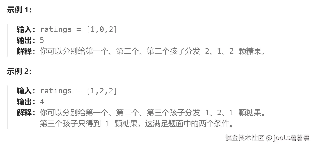 - 相邻两个孩子评分更高的孩子会获得更多的糖果。