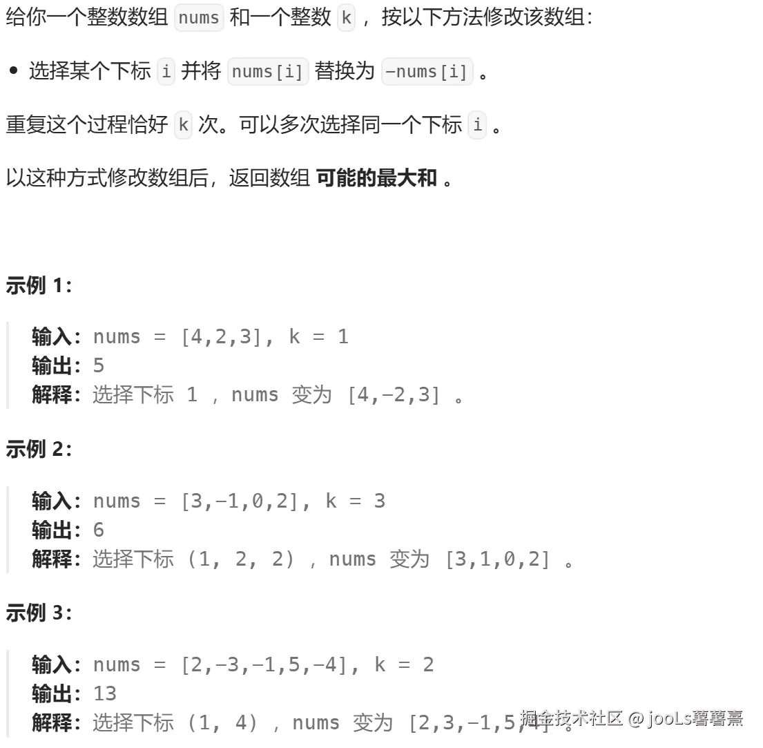 - 而如果所有负数取反之后有剩余且 k % 2 后剩余 1; 则将此时最小值取反则能得到最大和;