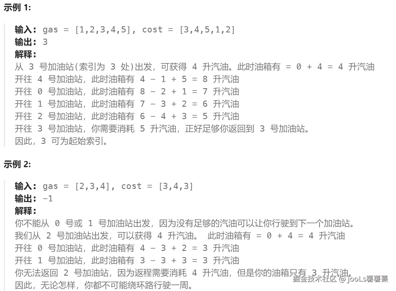 在一条环路上有 n 个加油站,其中第 i 个加油站有汽油 gas[i] 升。 你有一辆油箱容量无限的的汽车,从第 i 个加油站开往第 i+1 个加油站需要消耗汽油 cost[i] 升。
