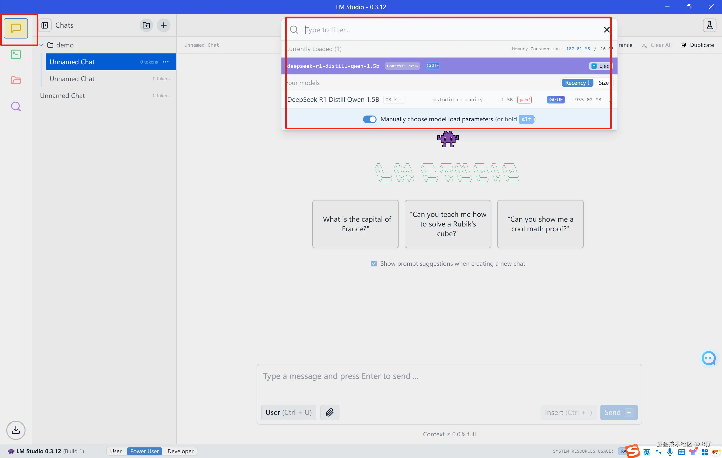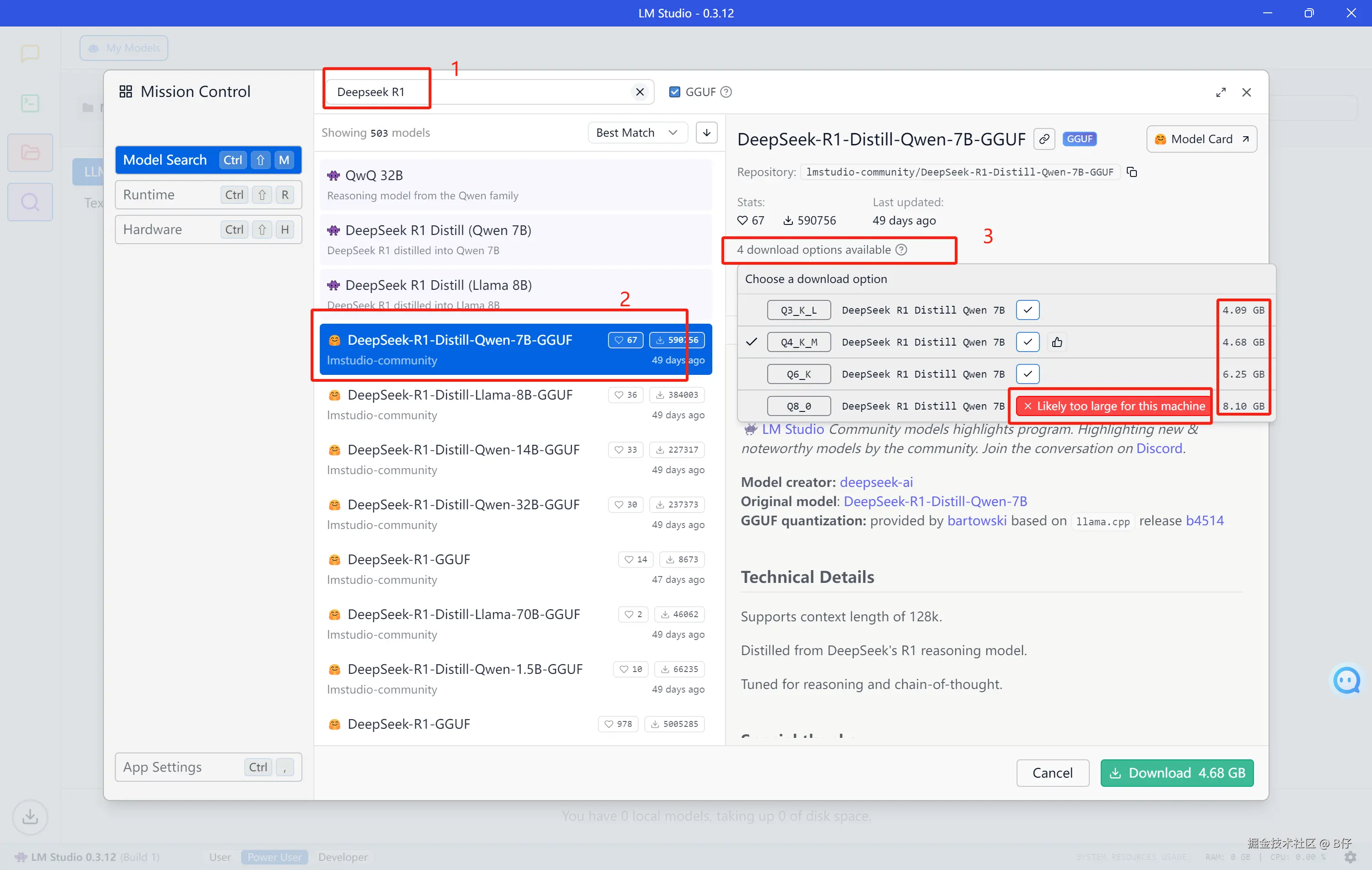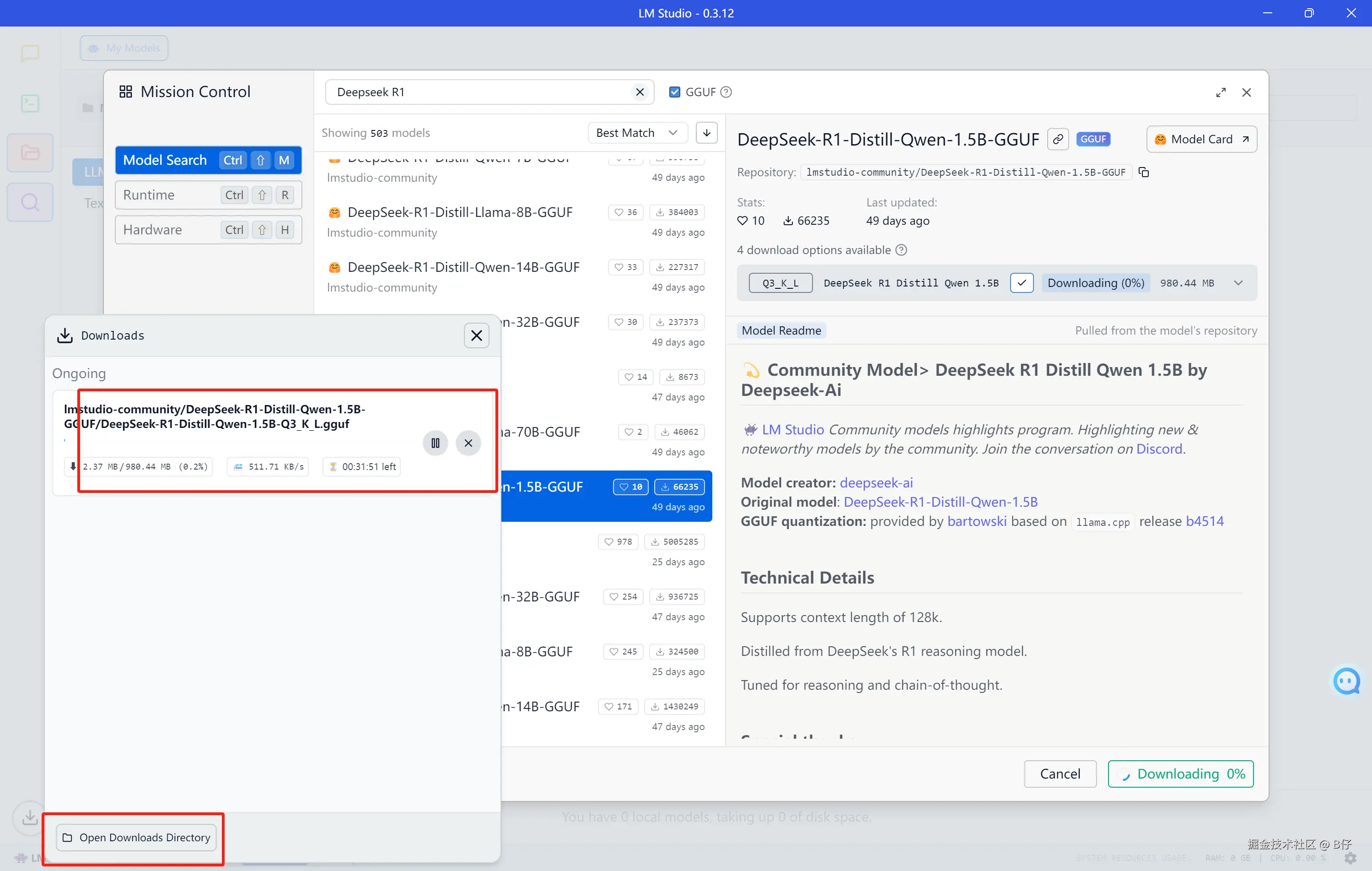 这里选择 lmstudio-community/DeepSeek-R1-Distill-Qwen-1.5B-GGUF