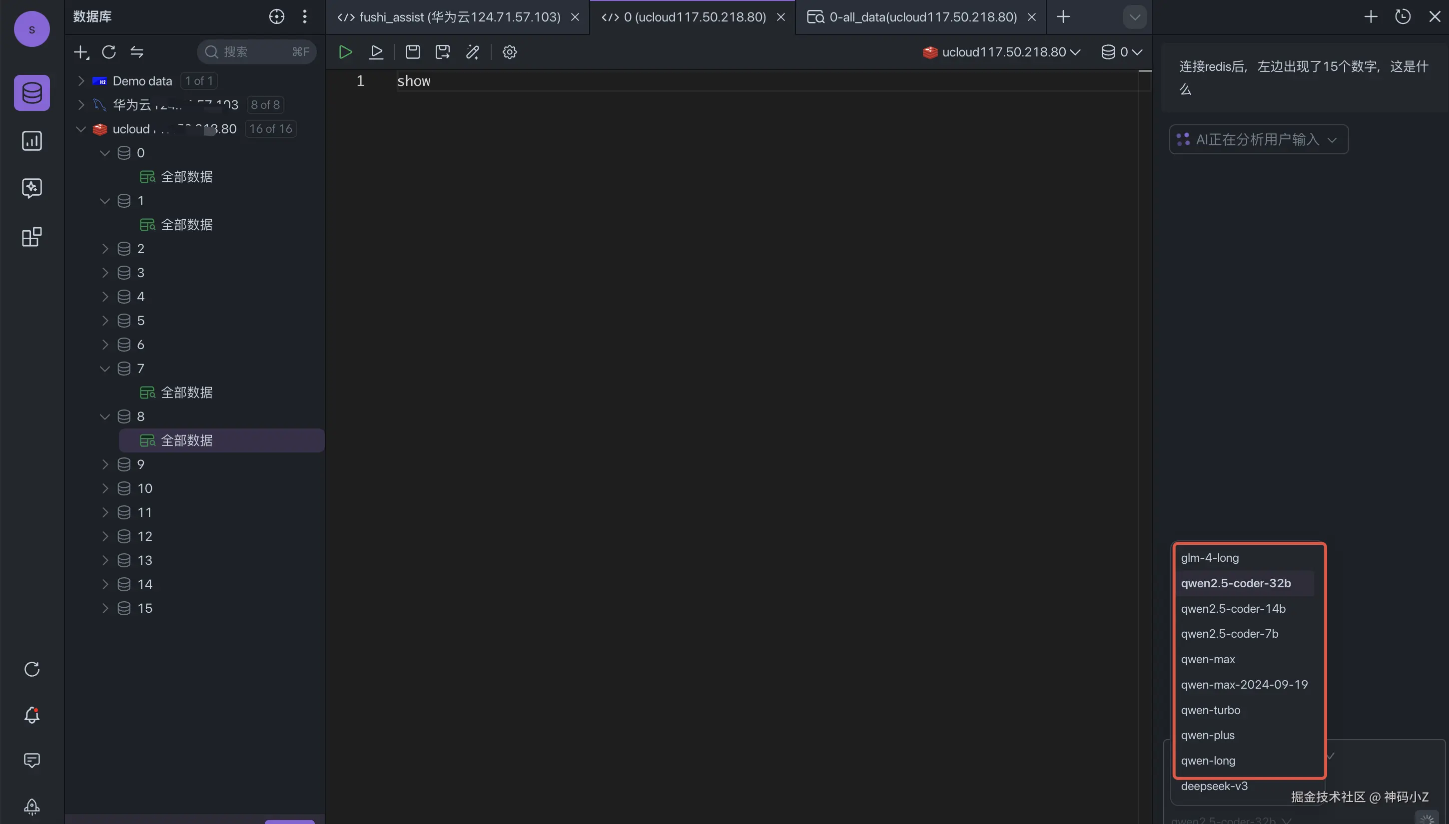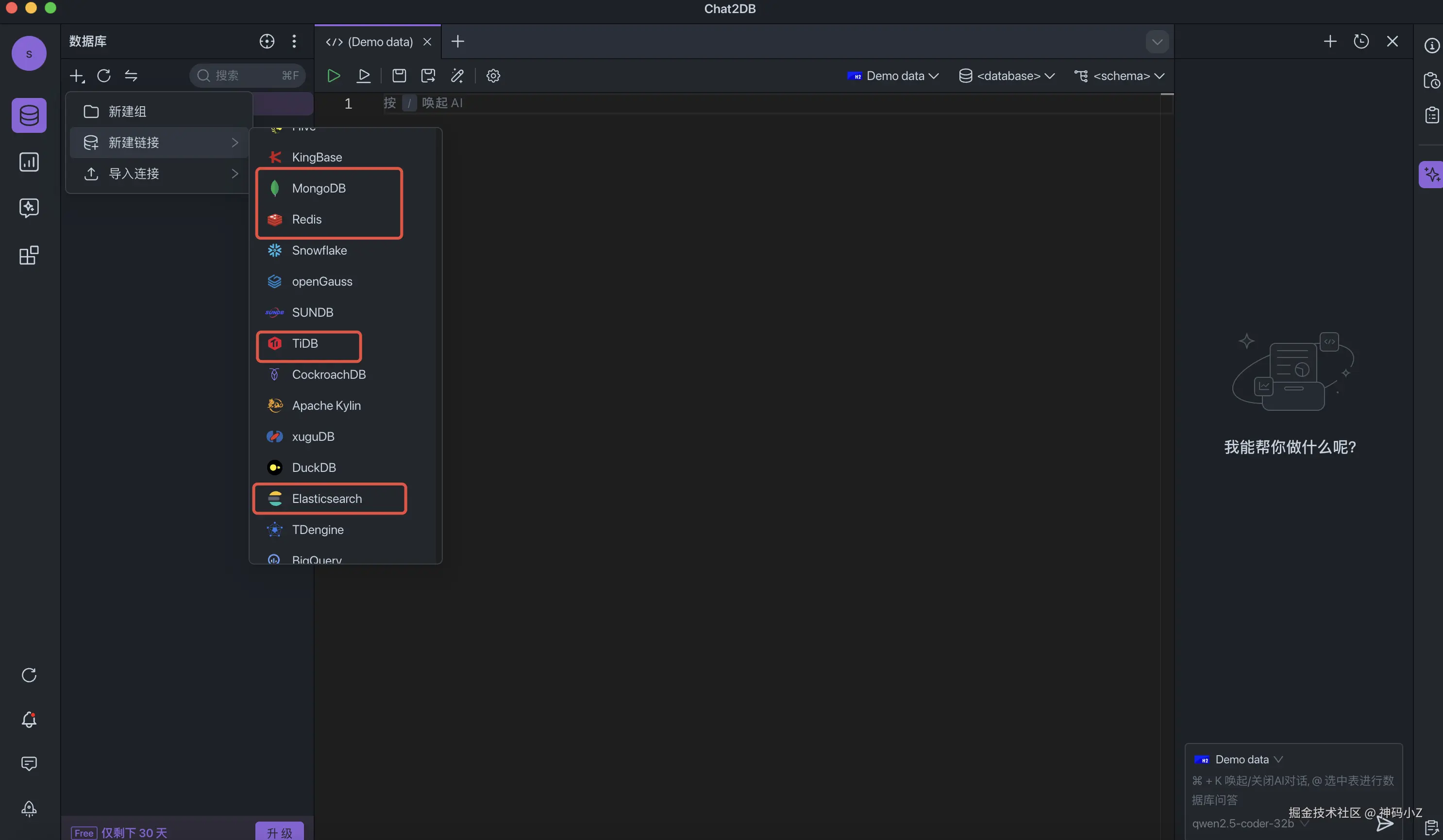 目前Chat2DB已支持Hive、Redis、Elasticsearch这些非关系型数据库,我之前文章也分享过Tiny RDM这样的Redis操作神器,不过现在只安装一个Chat2DB就可以了!